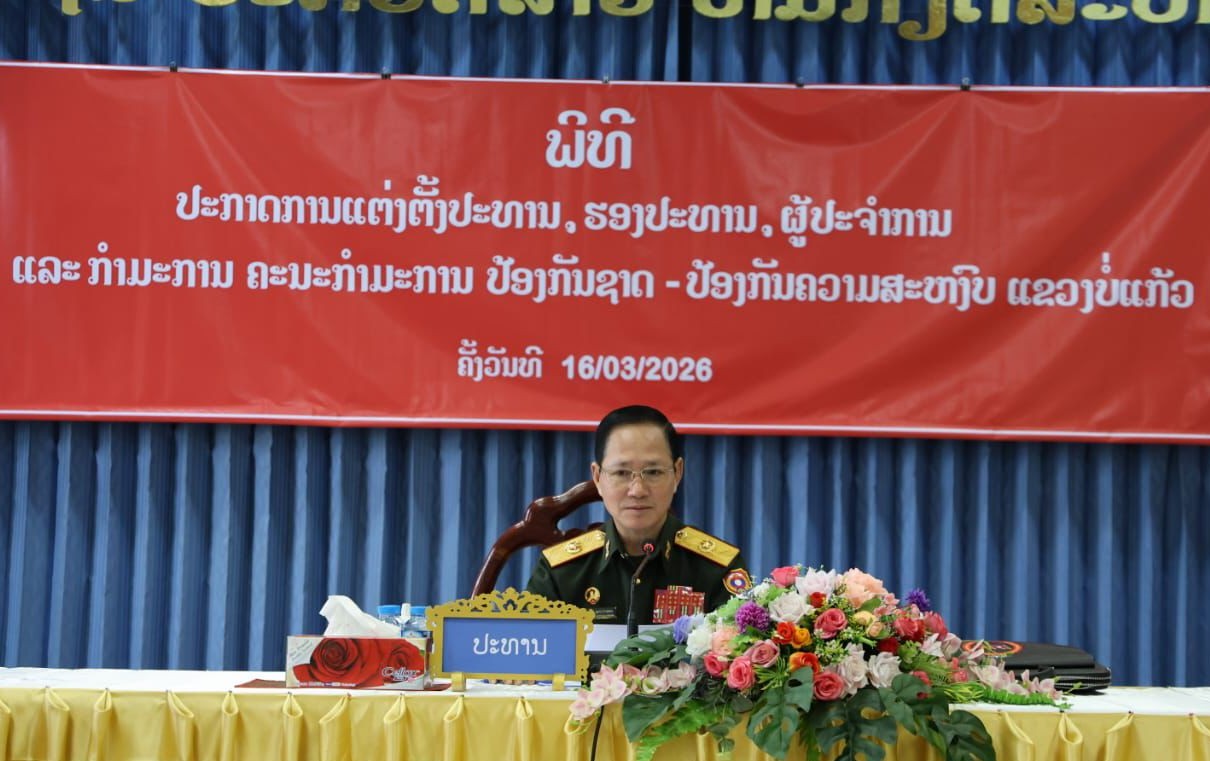 ພິທີປະກາດແຕ່ງຕັ້ງປະທານ, ຮອງປະທານ, ຜູ້ປະຈຳການ ແລະ ກຳມະການ ຄະນະກຳມະການ ປກຊ-ປກສ ແຂວງບໍ່ແກ້ວ ຈັດຂື້ນ ໃນວັນທີ 16 ມີນາ 2026, ຢູ່ທີ່ຫ້ອງປະຊຸມຫ້ອງວ່າການປົກຄອງແຂວງບໍແກ້ວ, ໂດຍການເປັນປະທານຂອງ ສະຫາຍ ພົນເອກ ຄໍາລຽງ ອຸທະໄກສອນ ກຳມະການກົມການເມືອງສູນກາງພັກ, ຄະນະກຳມະການ ປກຊ-ປກສ ສູນກາງ, ລັດຖະມົນຕີກະຊວງປ້ອງກັນປະເທດ, ມີສະຫາຍ ພົນຈັດຕະວາ ແປ້ນຄໍາ ບຸດຈັນແພງ ກຳມະການສູນກາງພັກ, ເລຂາຄະນະບໍລິຫານງານພັກ ແຂວງບໍ່ແກ້ວ, ມີກຳມະການພັກແຂວງ, ຄະນະຫ້ອງການຄະນະກຳມະການ ປ້ອງກັນຊາດ-ປ້ອງກັນຄວາມສະຫງົບ ສູນກາງ, ຫ້ອງການກະຊວງ ປກຊ-ປກສ, ຄະນະພັກ-ຄະນະບັນຊາ ກອງບັນຊາການ ປກຊ-ປກສ…