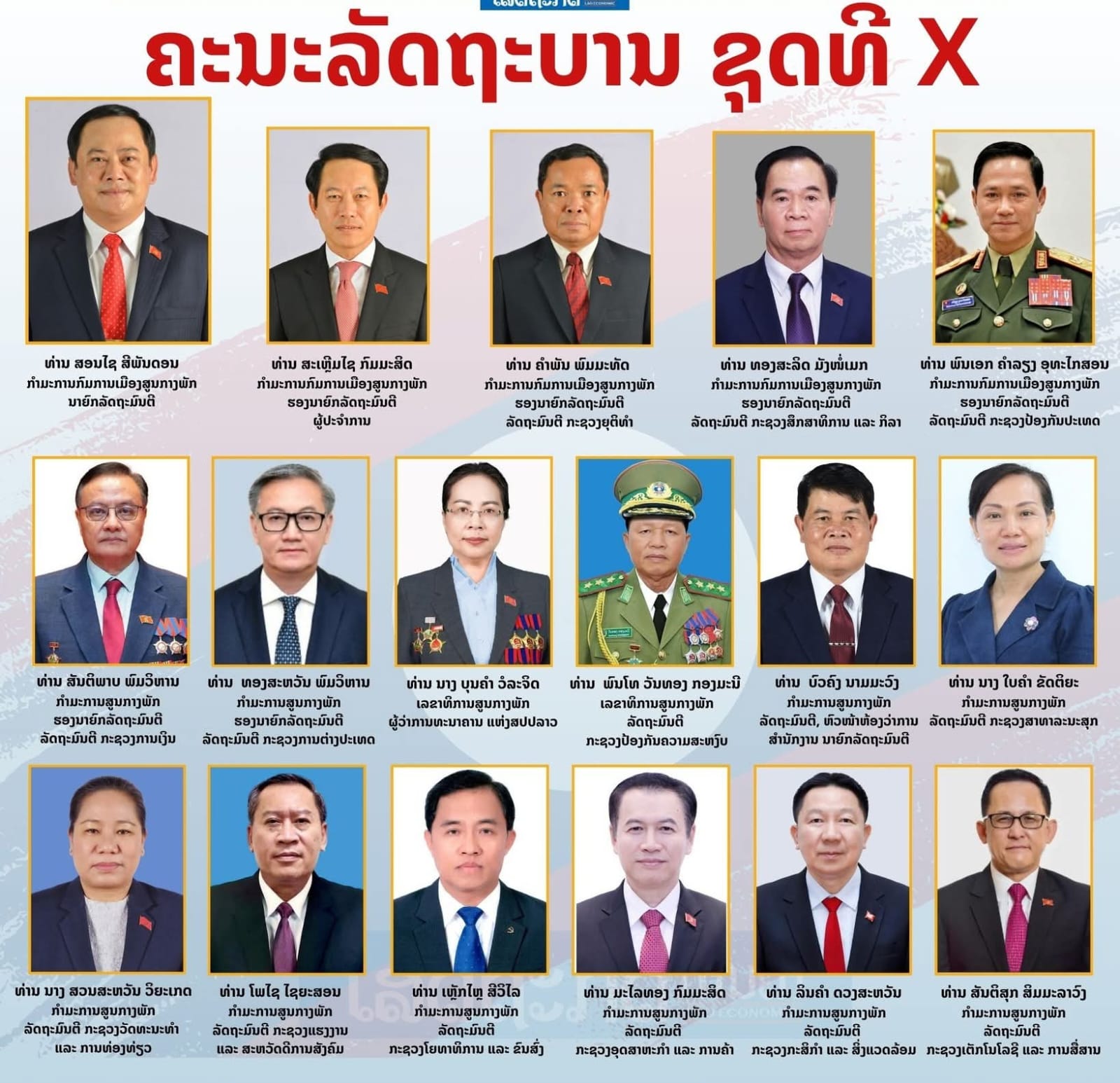23 ມີນາ 2026, ທ່ານ ສອນໄຊ ສີພັນດອນ ນາຍົກລັດຖະມົນຕີ ໄດ້ສະເໜີ ໂຄງປະກອບກົງຈັກລັດຖະບານ, ເປົ້າໝາຍແຕ່ງຕັ້ງຮອງນາຍົກລັດຖະມົນຕີ ແລະ ສະມາຊິກລັດຖະບານ ເຊິ່ງກົງຈັກລັດຖະບານ ຊຸດທີ X ມີ 13 ກະຊວງ ແລະ 2 ອົງການທຽບເທົ່າກະຊວງ ຕໍ່ກອງປະຊຸມຄັ້ງປະຖົມມະລຶກ ສະພາແຫ່ງຊາດ ຊຸດທີ X. ກອງປະຊຸມ ໄດ້ລົງຄະແນນສຽງ ຮັບຮອງເອົາ ການແຕ່ງຕັ້ງຮອງນາຍົກ, ຮັບຮອງເອົາໂຄງປະກອບກົງຈັກລັດຖະບານ ແລະ ສະມາຊິກລັດຖະບານ ດ້ວຍຄະແນນສຽງເຫັນດີເປັນເອກະສັນ ຄະນະລັດຖະບານ ຊຸດທີ X ມີທັງໝົດ 17 ທ່ານ ດັ່ງນີ້:…